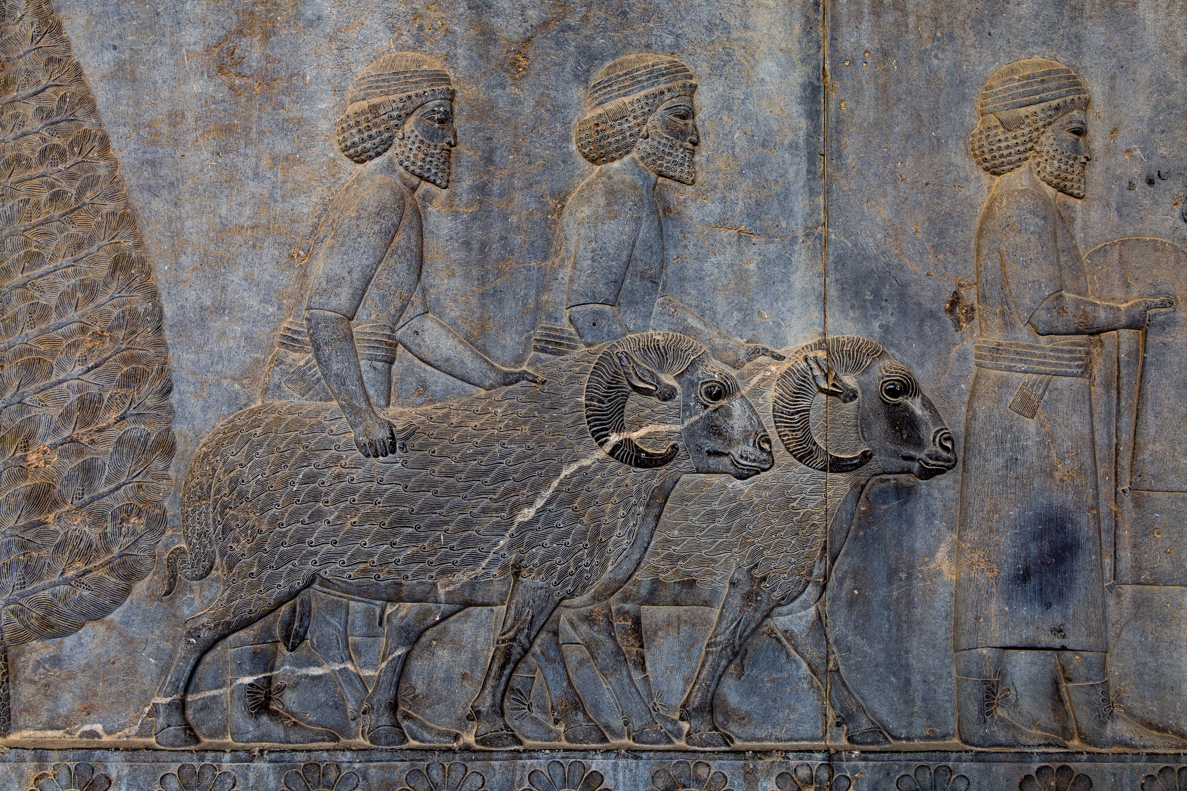 The Apadana reliefs depict a procession of dignitaries who have to come to pay homage to Persia’s ‘king of kings’. Each group of figures represents a specific nation within the empire and each is recognisable by their clothing and their choice of gift. In one section you can see the Lydian envoys (who occupied the Aegean coast) in their fringed coats holding vases and cloth. Behind them are a pair of Armenians bringing wine to the Emperor while the Scythians bring horses and gold bracelets. The Thracians bring weaponry and the Libyans bring chariots and spears and horned goats. Between each set of supplicants are Persian guides – many of whom are walking hand-in-hand with their guests. Peyman clearly took pride in the fact that he was, in a sense, performing the same role, in the same place, two and half thousand years later.