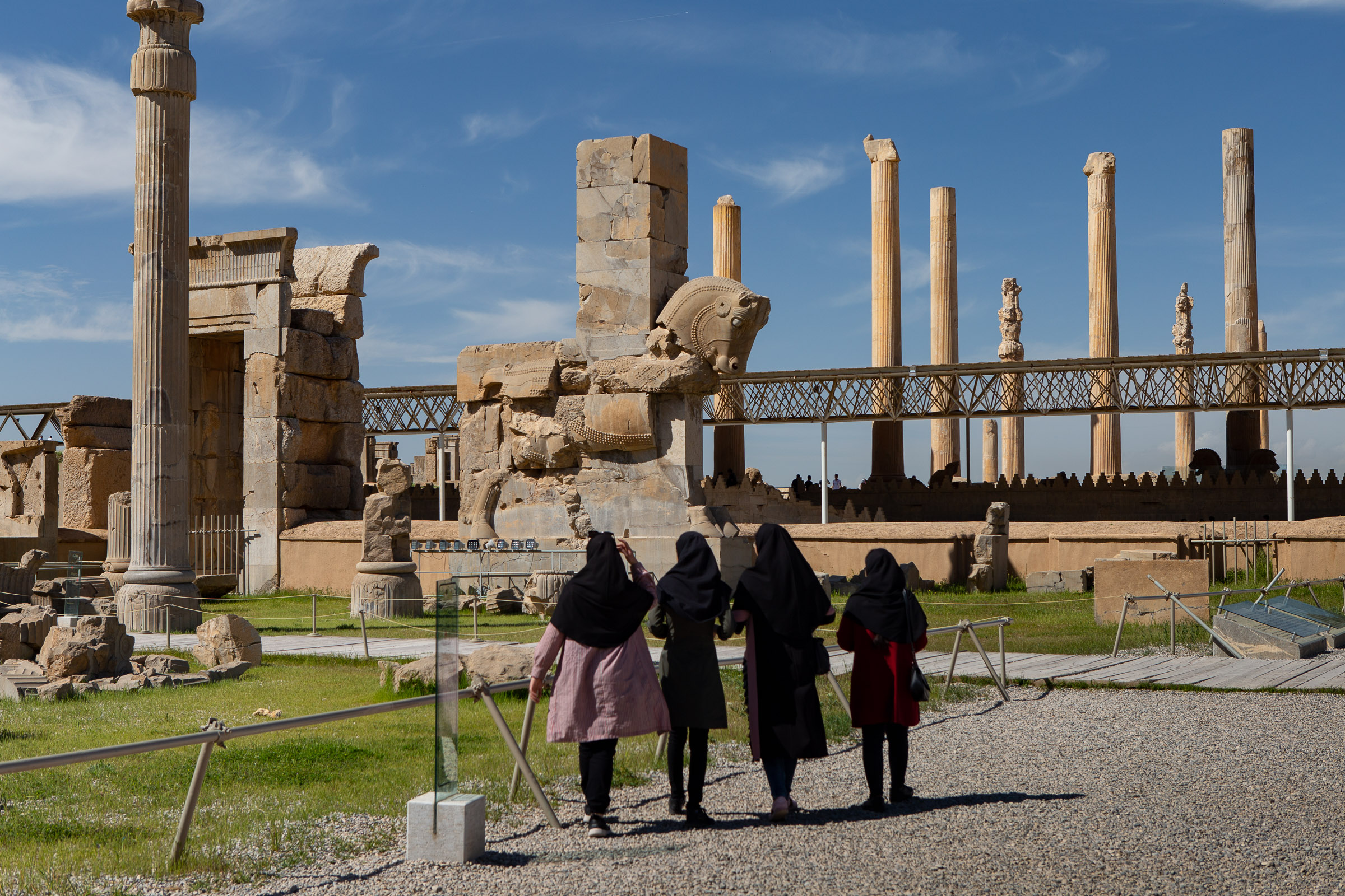When we arrived at Persepolis we joined the crowds and followed Peyman up the wide staircase to the entrance of the palace complex – following the same route that representatives of the various kingdoms would have taken when they made their yearly trip to pay tribute to the Emperor. At the top of the stairs we found ourselves in the shadow of two enormous stone lamassu – mythical winged bulls with (once) human faces. These guardians were supposed to represent the power and authority of the Achaemenid royal family and, much like medieval gargoyles, their presence was believed to ward off evil. Our companion Matt, who is a dual American/Australian citizen and therefore part-hellspawn of The Great Satan, managed to pass through the gates without incident so their magic appears to have worn off. Having passed safely through the Gate of All Nations we entered the main courtyard outside the Apadana Palace and saw local tourists with VR headsets marvelling at what the city would have looked like in its original form.