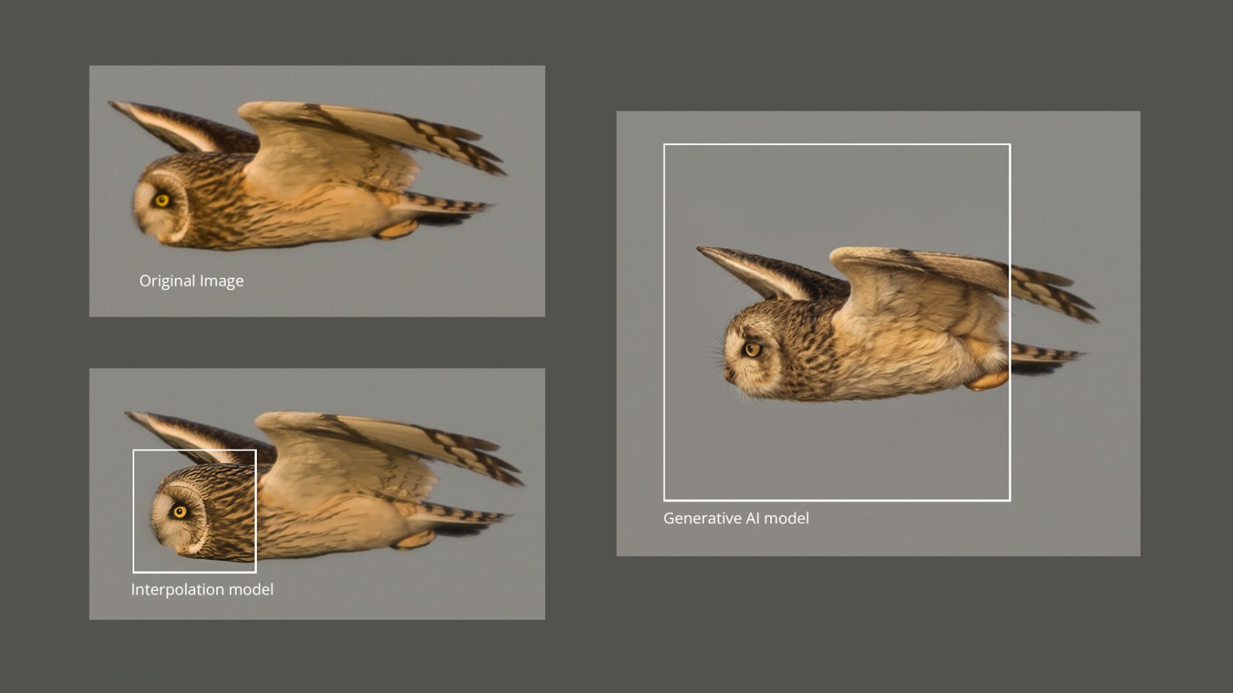 You can see examples of these two methods of ‘upscaling’ in a recent post on Stack Exchange. Responding to a question about how these techniques differ photographer Steven Kersting provided an object lesson in the shortcomings of generative AI. To demonstrate the technology he used a photo he’d previously taken of an owl in flight where the camera’s shutter speed had been a fraction too slow. What he ended up with was a profile of slightly blurry owl. Amassing an enormous collection of blurry bird photos is an occupational hazard for any wildlife photographer but, until recently, there wasn’t much you could do to salvage those images.